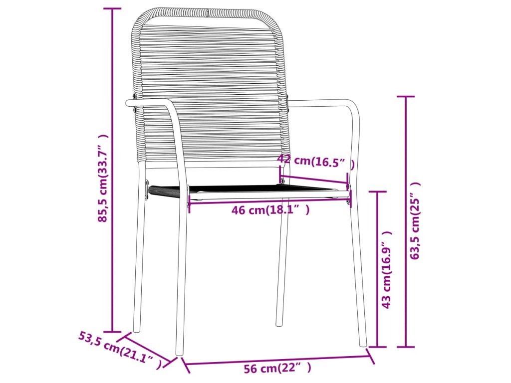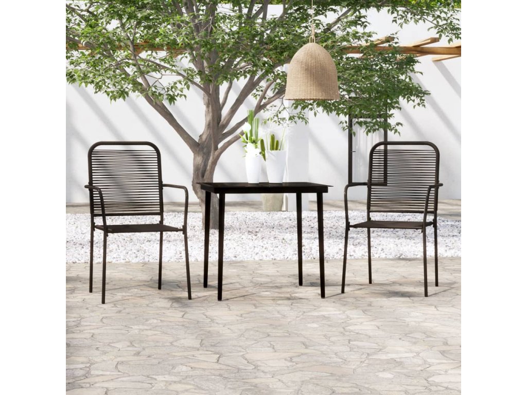 Tato zahradní jídelní souprava má ocelový rám s práškovým nástřikem, což dodává stolu a židlím na stabilitě a odolnosti. Opěradlo a sedák jsou vyrobeny ze spleteného bavlněného lanka, které je měkké na dotek a pevné pro dlouhodobé používání. Stůl má desku z tvrzeného skla, která se snadno čistí vlhkým hadříkem a je ideální pro servírování jídel a nápojů či vystavení různých dekorativních předmětů.