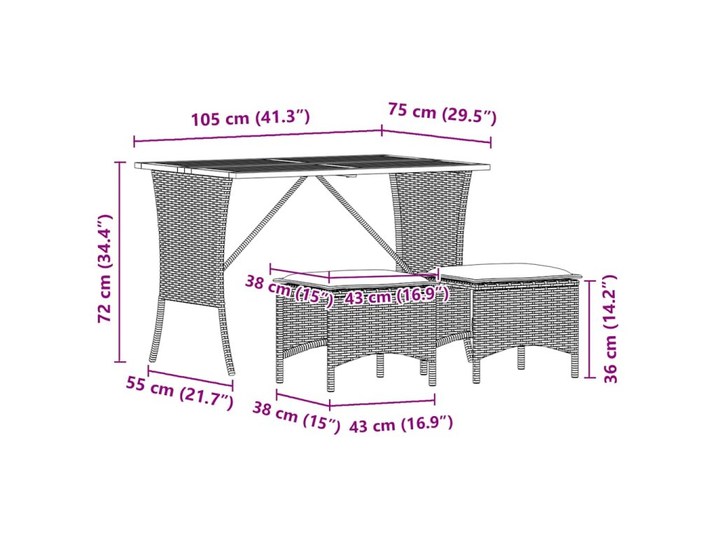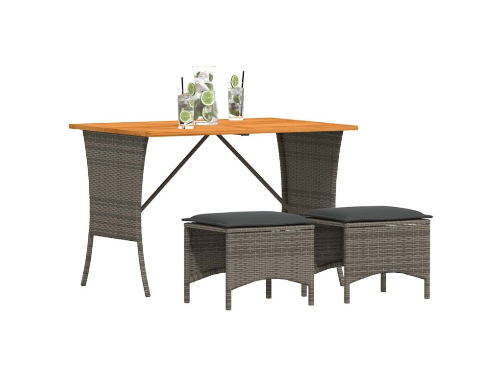 - Materiál: PE ratan, práškově lakovaná ocel, masivní akáciové dřevo s přírodní olejovou povrchovou úpravou