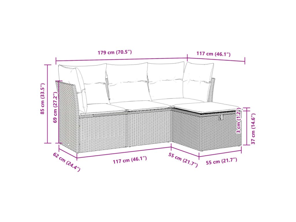 Tato zahradní sedací souprava je dokonalým doplňkem vaší zahrady, terasy nebo dvorku a poskytne vám pohodlné a příjemné místo, kde si můžete povídat s rodinou a přáteli nebo jen tak odpočívat a užívat si pobyt venku.