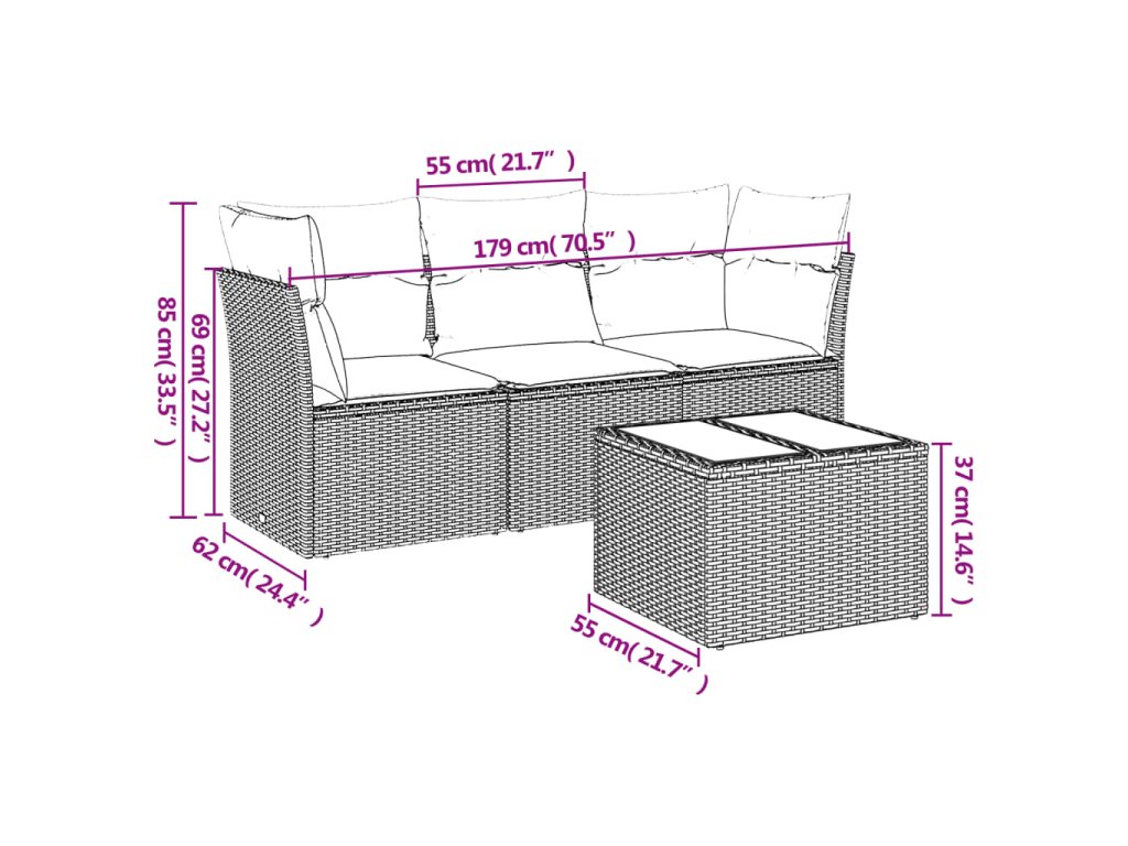 Tato zahradní sedací souprava je dokonalým doplňkem vaší zahrady, terasy nebo dvorku a poskytne vám pohodlné a příjemné místo, kde si můžete povídat s rodinou a přáteli nebo jen tak odpočívat a užívat si pobyt venku.