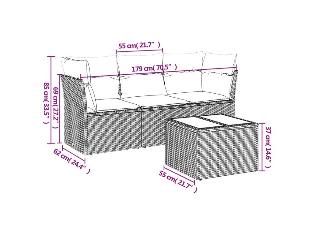 Tato zahradní sedací souprava je dokonalým doplňkem vaší zahrady, terasy nebo dvorku a poskytne vám pohodlné a příjemné místo, kde si můžete povídat s rodinou a přáteli nebo jen tak odpočívat a užívat si pobyt venku.