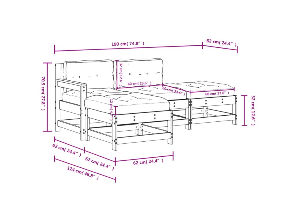 - Rozměry středové pohovky: 62 x 62 x 70,5 cm (D x Š x V)