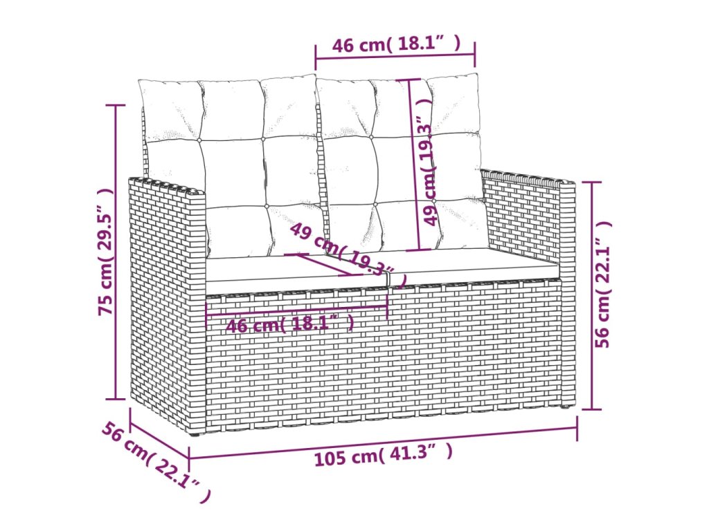 - Rozměry dvoumístné pohovky: 105 x 56 x 75 cm (Š x H x V)