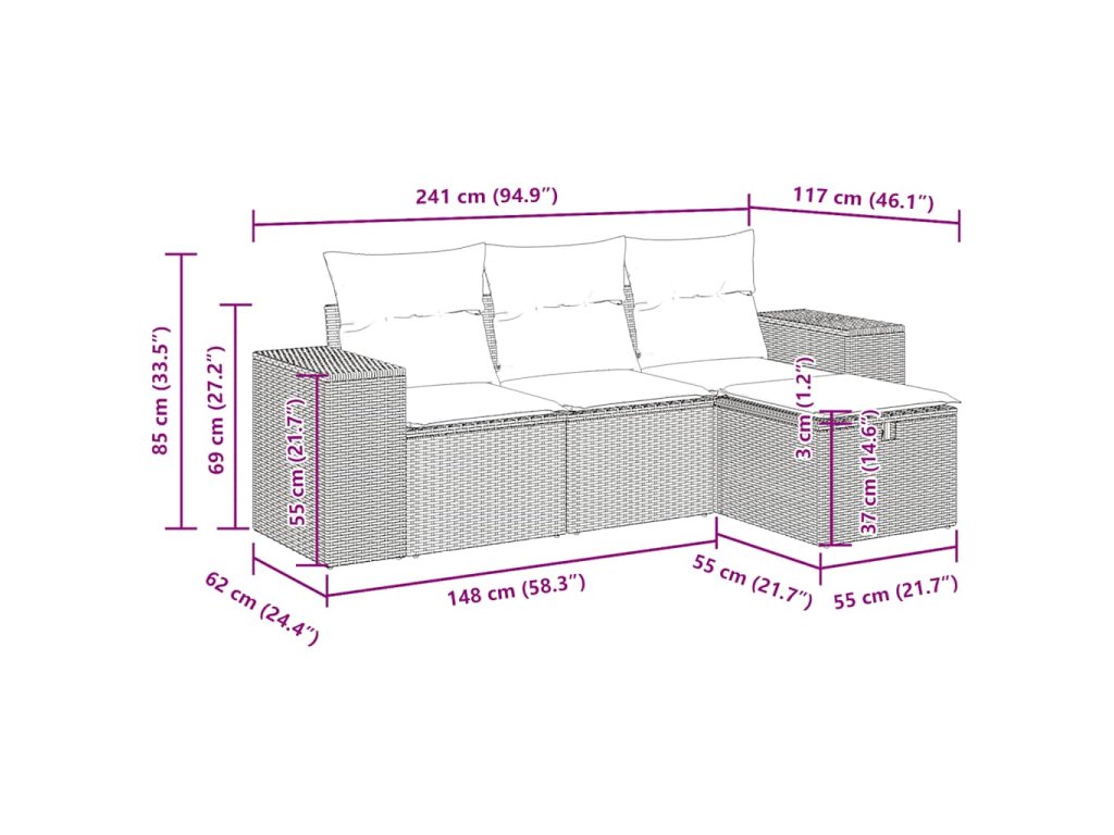 Tato zahradní sedací souprava je dokonalým doplňkem vaší zahrady, terasy nebo dvorku a poskytne vám pohodlné a příjemné místo, kde si můžete povídat s rodinou a přáteli nebo jen tak odpočívat a užívat si pobyt venku.