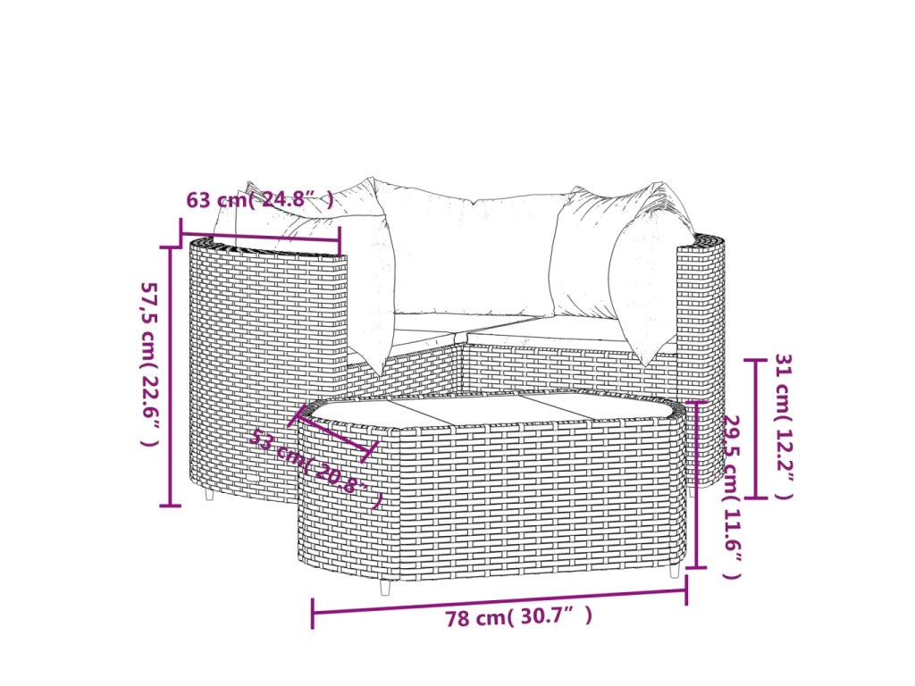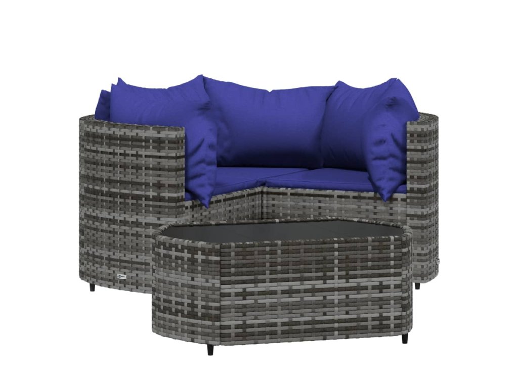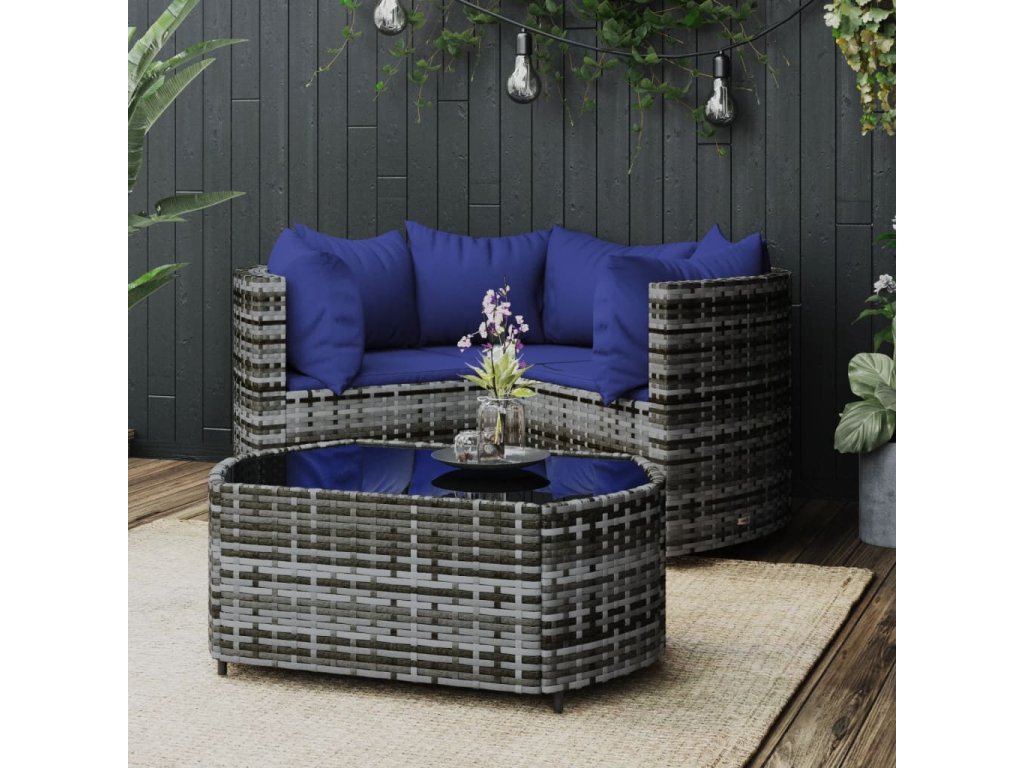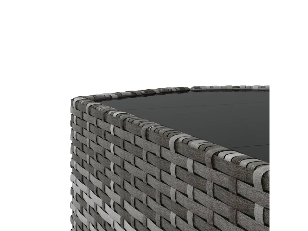 - Materiál: PE ratan, práškově lakovaná ocel, tkanina (100% polyester), tvrzené sklo
