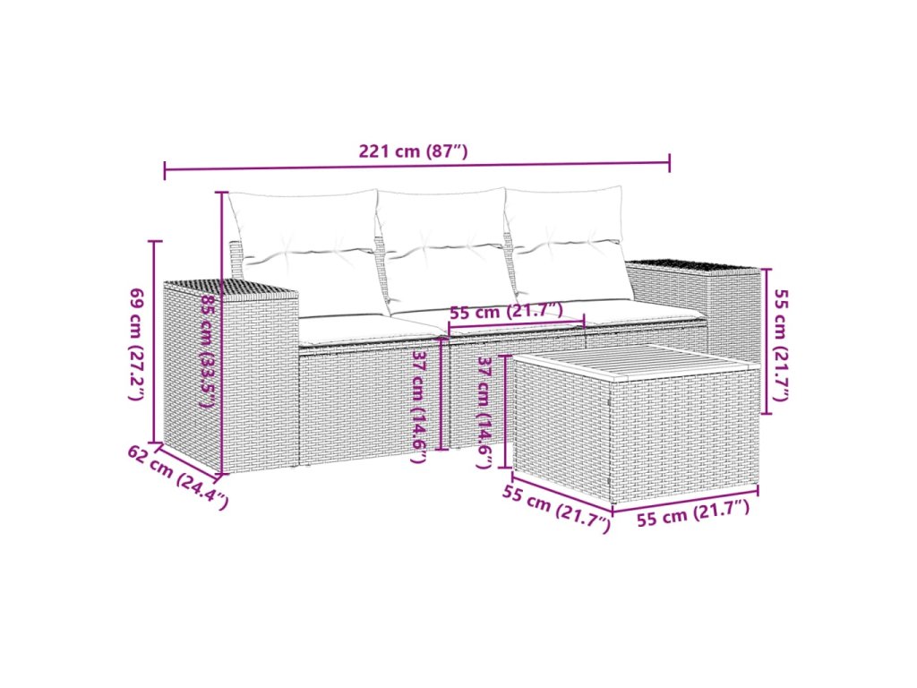 Tato zahradní sedací souprava je dokonalým doplňkem vaší zahrady, terasy nebo dvorku a poskytne vám pohodlné a příjemné místo, kde si můžete povídat s rodinou a přáteli nebo jen tak odpočívat a užívat si pobyt venku.