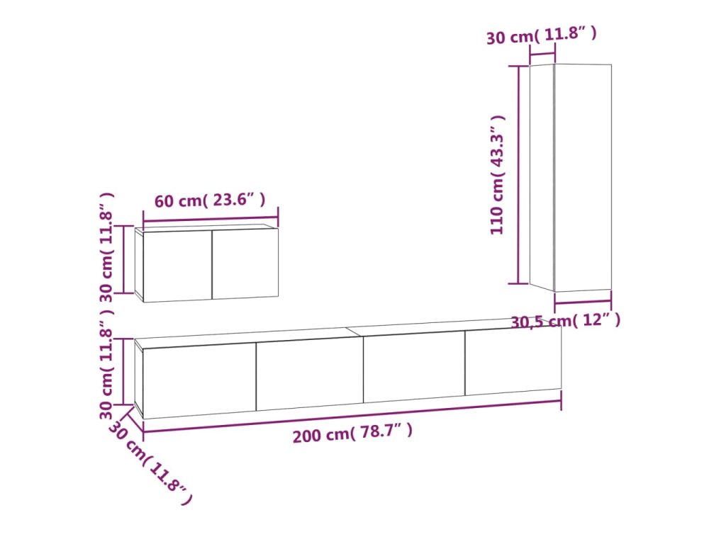 - 1x TV skříňka: 30,5 x 30 x 110 cm (Š x H x V)