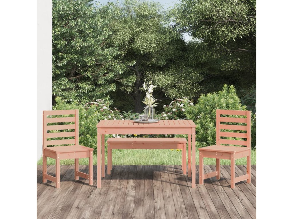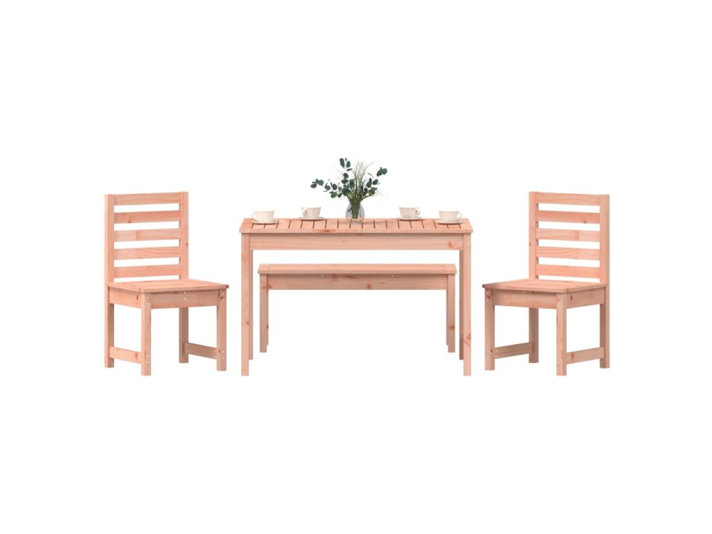 - Masivní dřevo douglasky: Jídelní set je vyroben z masivní douglasky. Masivní dřevo douglasky je vysoce odolný druh dřeva, který se výborně hodí pro venkovní použití. Dřevo douglasky je také pevné a vyžaduje méně údržby i pod vlivem povětrnostních podmínek.