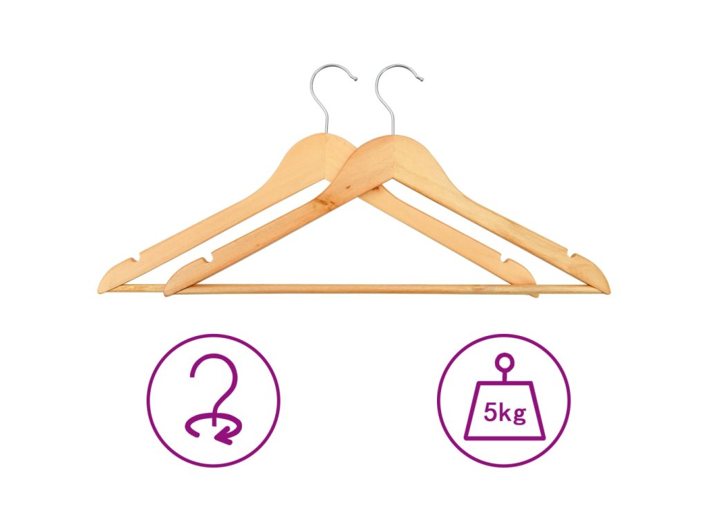 Dřevěná šatní ramínka v této sadě jsou vyrobená z tvrdého dřeva a kovu, takže mají dlouhou životnost a jsou dostatečně pevná, aby unesla i těžší oblečení. Kolem dokola otočný háček poskytuje flexibilitu při organizaci oblečení na různých místech. Dvě drážky na obou stranách ramínka zabraňují sklouznutí oblečení nebo oděvních doplňků.