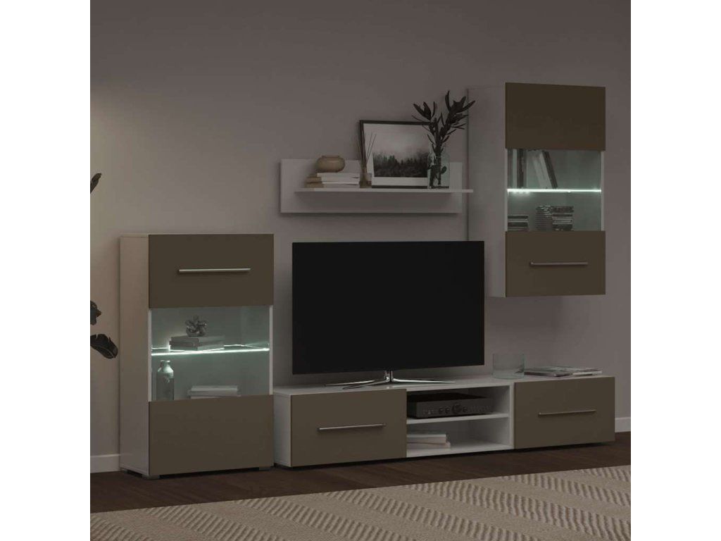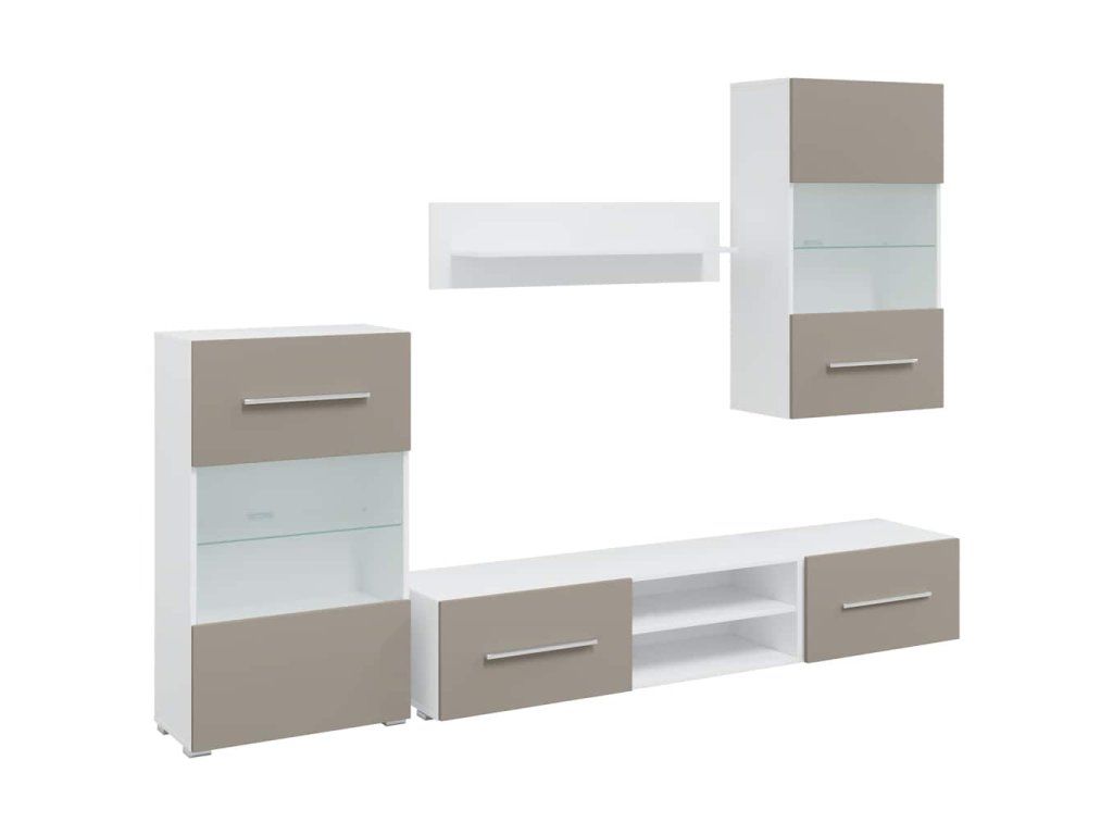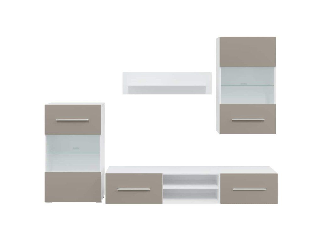 - Vylepšené funkce: Skříňky pod televizor mají výklopná dvířka pro skrytý úložný prostor. Nástěnné a stojanové skříňky mají částečně prosklená dvířka a skleněnou polici s úsporným LED osvětlením, což jim dodává praktičnost i eleganci.