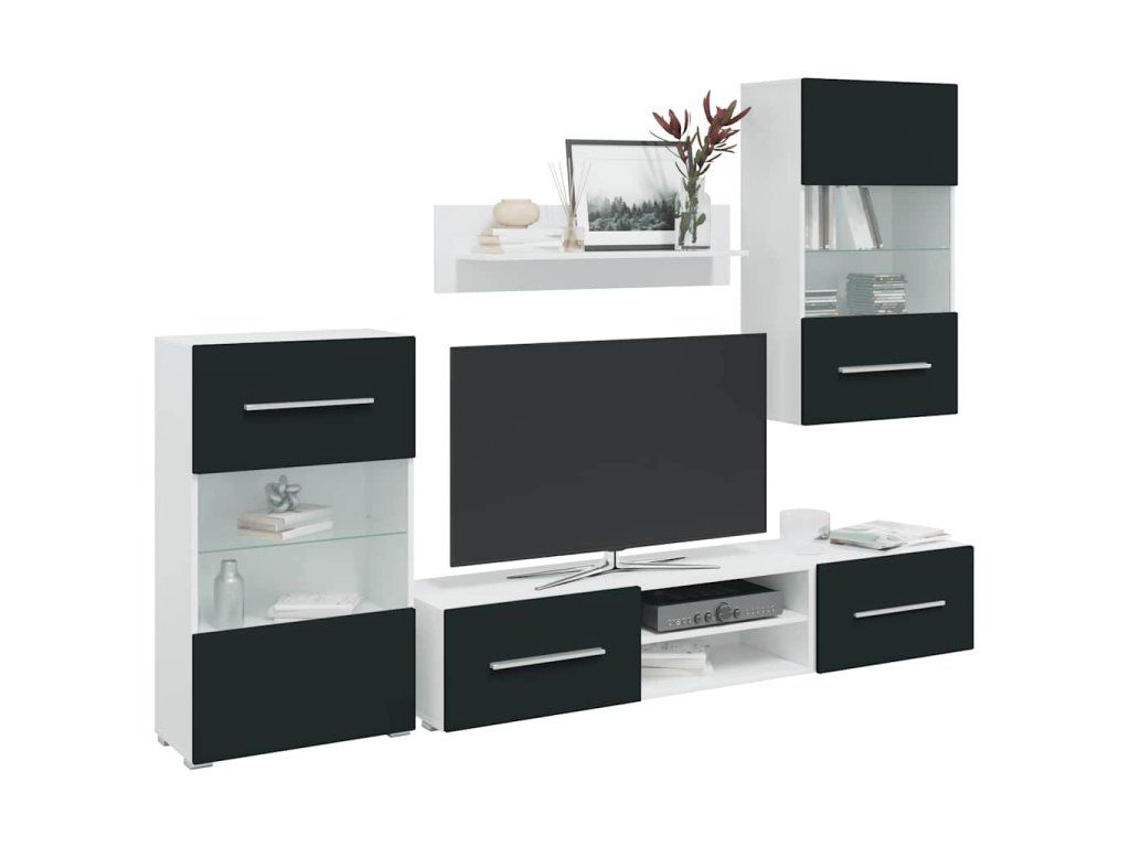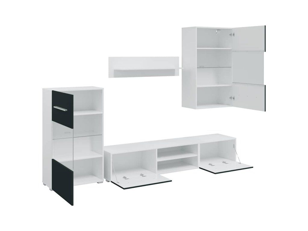 - Dostatek úložného prostoru: Sada obsahuje nástěnnou skříňku, stojící skříňku, dvě nízké desky a nástěnnou polici. Nabízí univerzální úložný prostor pro multimediální zařízení, knihy a menší předměty a zároveň poskytuje prostor pro dekorativní vitríny.