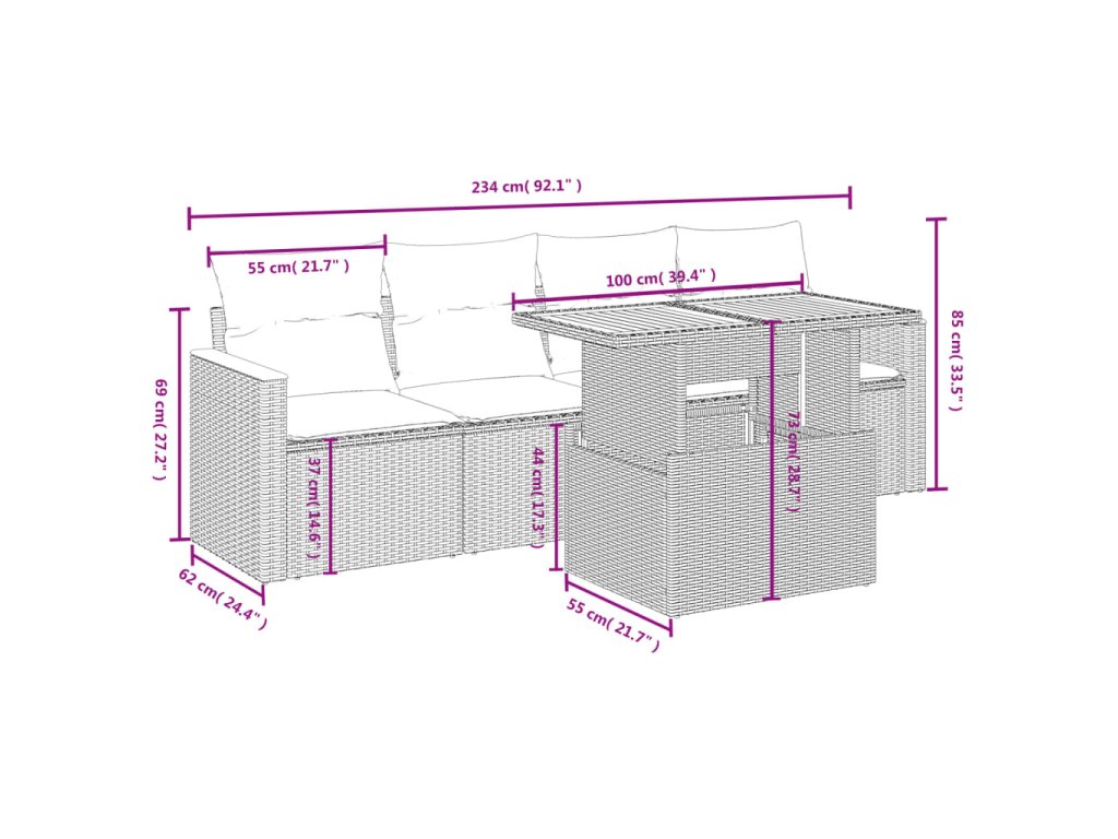 Tato zahradní sedací souprava je dokonalým doplňkem vaší zahrady, terasy nebo dvorku a poskytne vám pohodlné a příjemné místo, kde si můžete povídat s rodinou a přáteli nebo jen tak odpočívat a užívat si pobyt venku.