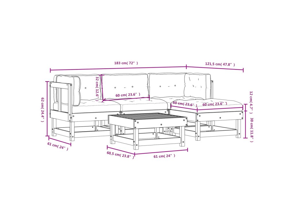 - Rozměry středové pohovky: 61 x 60,5 x 62 cm (D x Š x V)