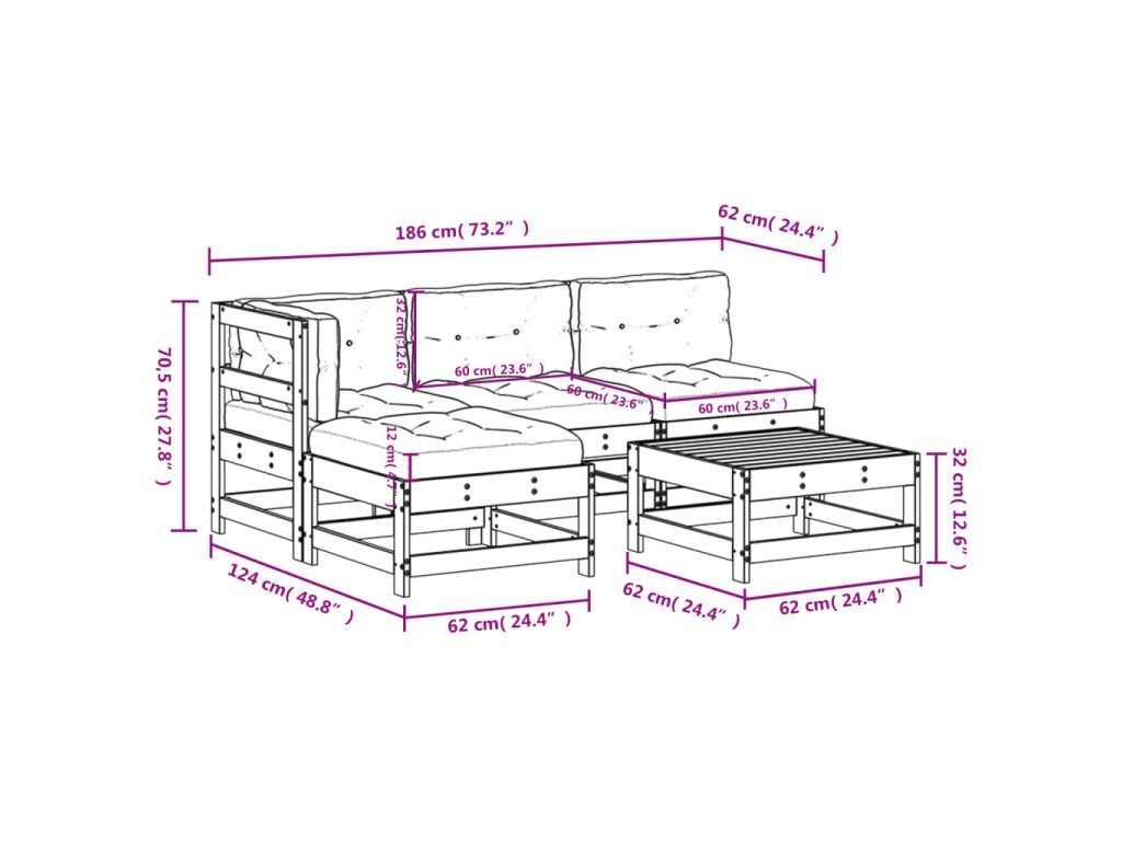 - Rozměry středové pohovky: 62 x 62 x 70,5 cm (D x Š x V)