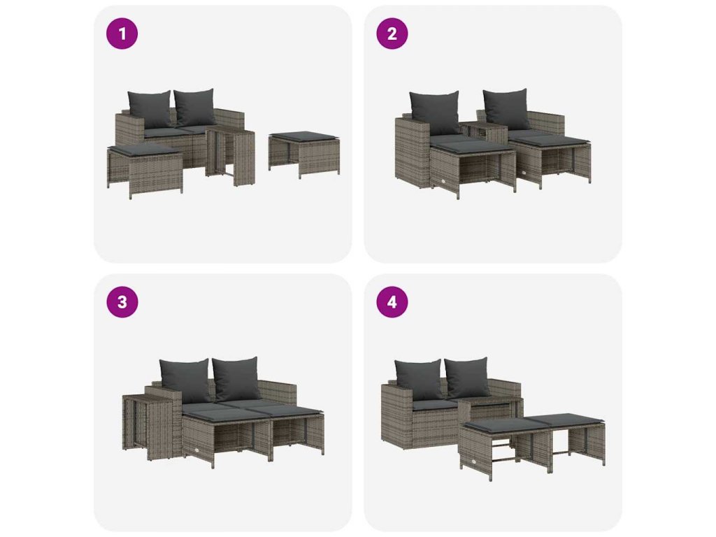- Modulární design: Tato sada venkovního nábytku se vyznačuje modulární konstrukcí, je tedy zcela flexibilní a lze ji snadno přemisťovat, takže si můžete uspořádat venkovní nábytek dle vašich potřeb.