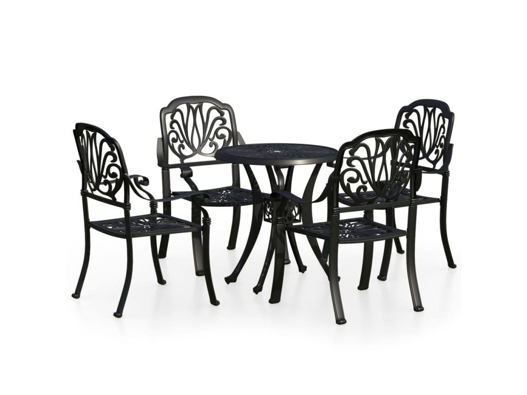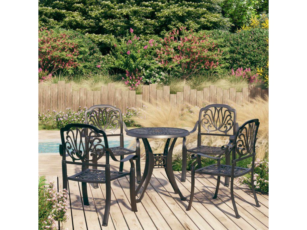 Zahradní stůl a židle z litého hliníku jsou robustní a hodně toho vydrží. Jelikož jsou vyrobené z materiálu, který nerezaví a nepodléhá klimatickým vlivům, jedná se o ideální nábytek pro venkovní použití. Vzhledem ke svému překrásnému designu zapůsobí bistro set ve vašem venkovním bydlení jako elegantní doplněk. Konferenční stolek má navíc uprostřed otvor, kam můžete zasunout slunečník, abyste se ochránili před sluníčkem či deštěm.