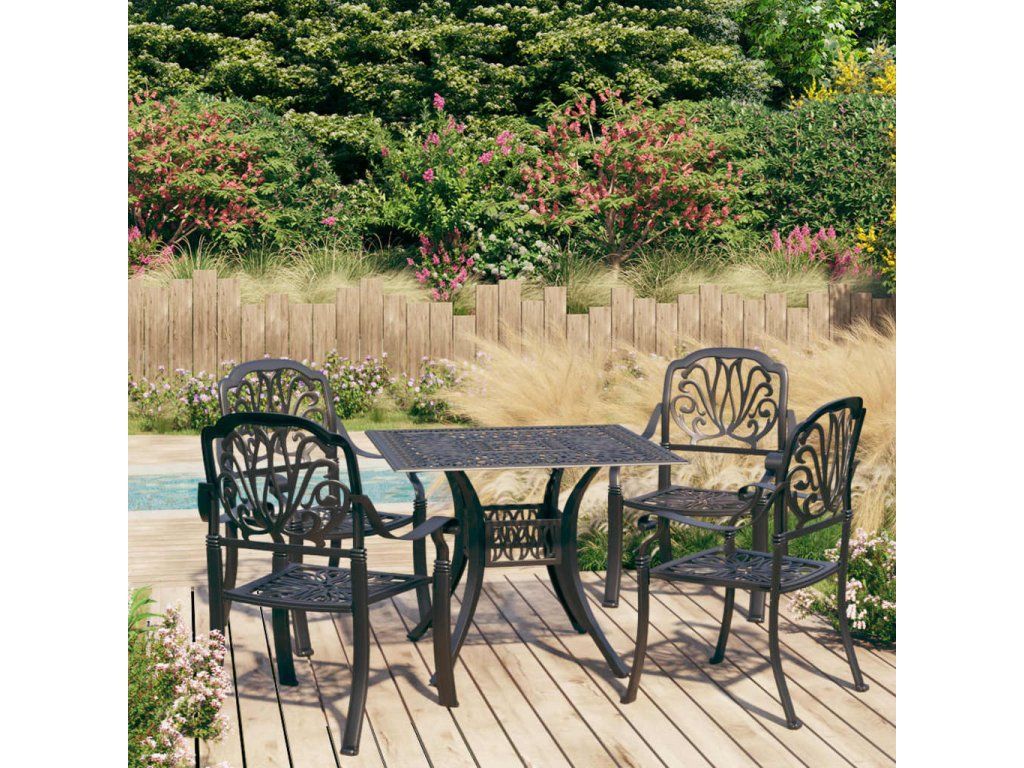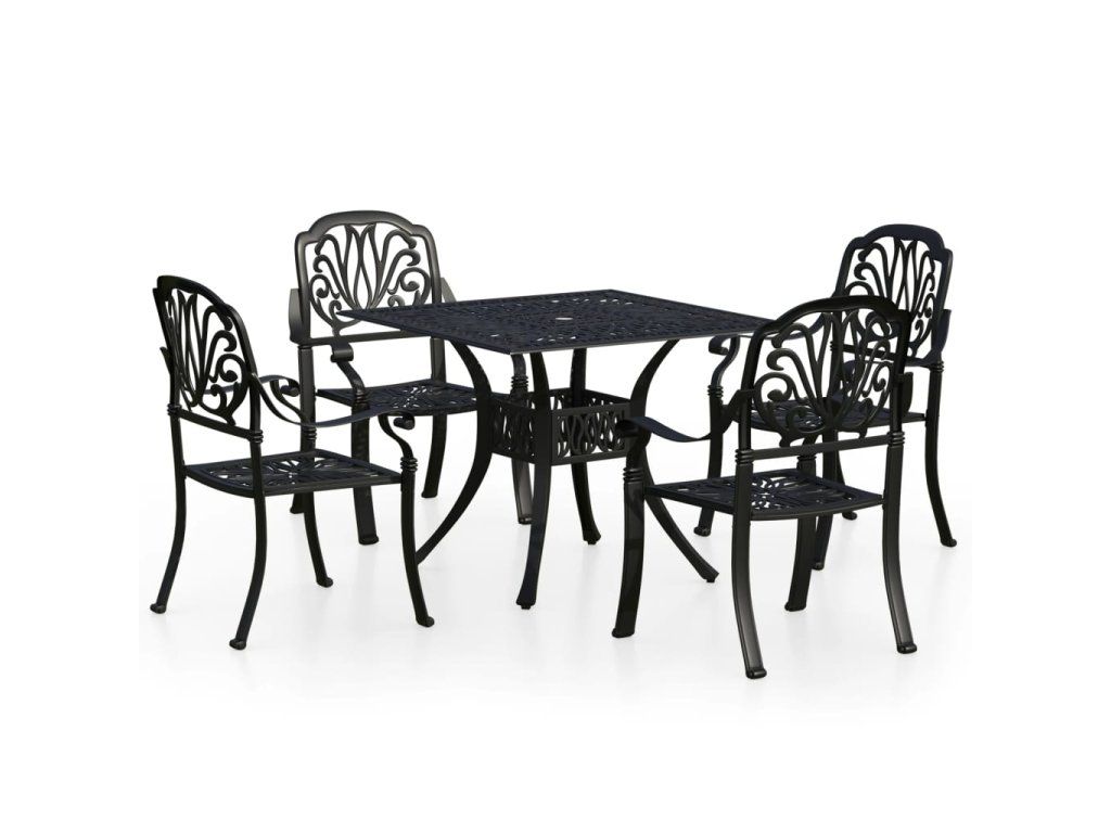 Zahradní stůl a židle z litého hliníku jsou robustní a hodně toho vydrží. Jelikož jsou vyrobené z materiálu, který nerezaví a nepodléhá klimatickým vlivům, jedná se o ideální nábytek pro venkovní použití. Vzhledem ke svému překrásnému designu zapůsobí bistro set ve vašem venkovním bydlení jako elegantní doplněk. Konferenční stolek má navíc uprostřed otvor, kam můžete zasunout slunečník, abyste se ochránili před sluníčkem či deštěm.