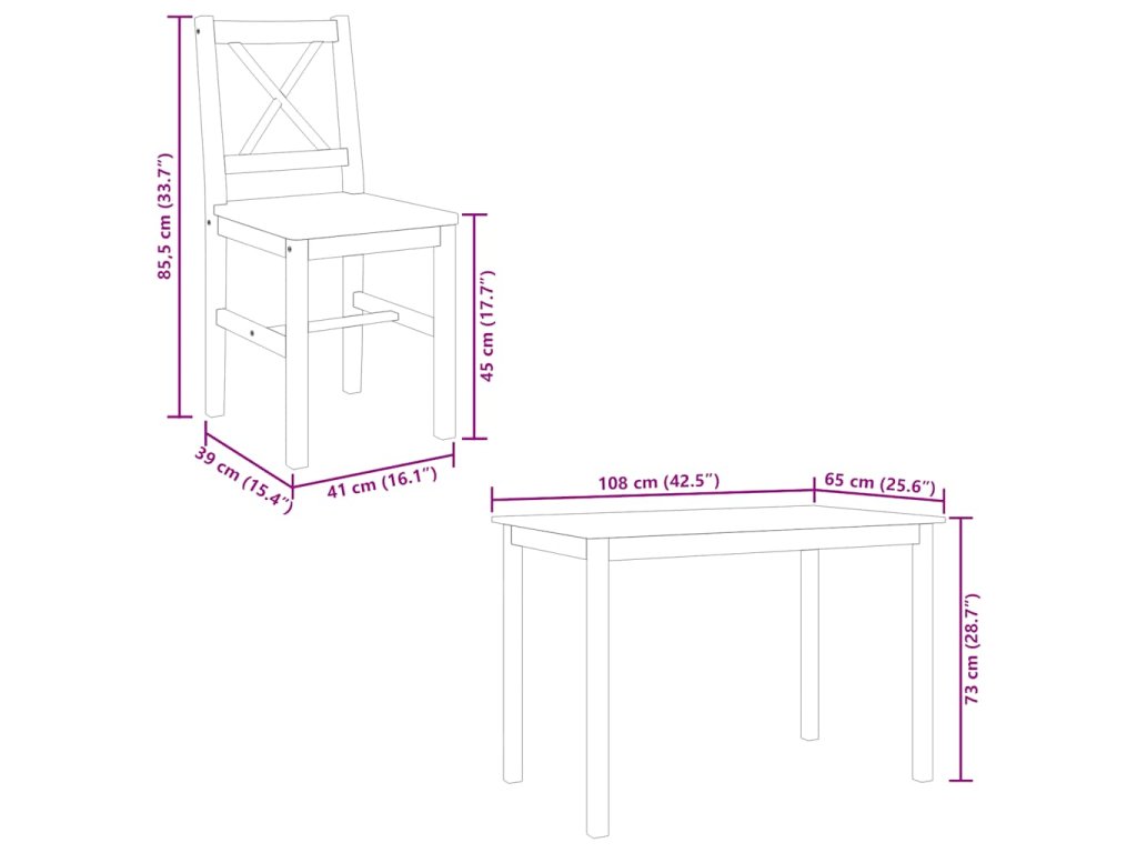 Tento jídelní set je zhotovený z masivního dřeva s atraktivní a elegantní povrchovou úpravou. Kvalita dřeva vám zaručuje roky spokojeného používání. Zásilka obsahuje čtyři židle a stůl.