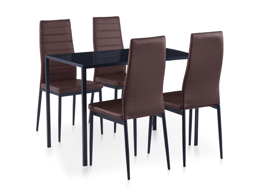Stolní deska je vyrobena z velmi pevného tvrzeného skla, které se snadno čistí. Každá židle je čalouněná kvalitní umělou kůží. Pružné polstrované sedáky jsou velmi pohodlné.