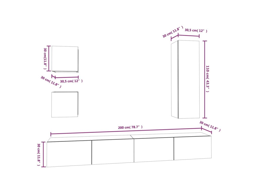 - 1x TV skříňka: 30,5 x 30 x 110 cm (D x Š x V)