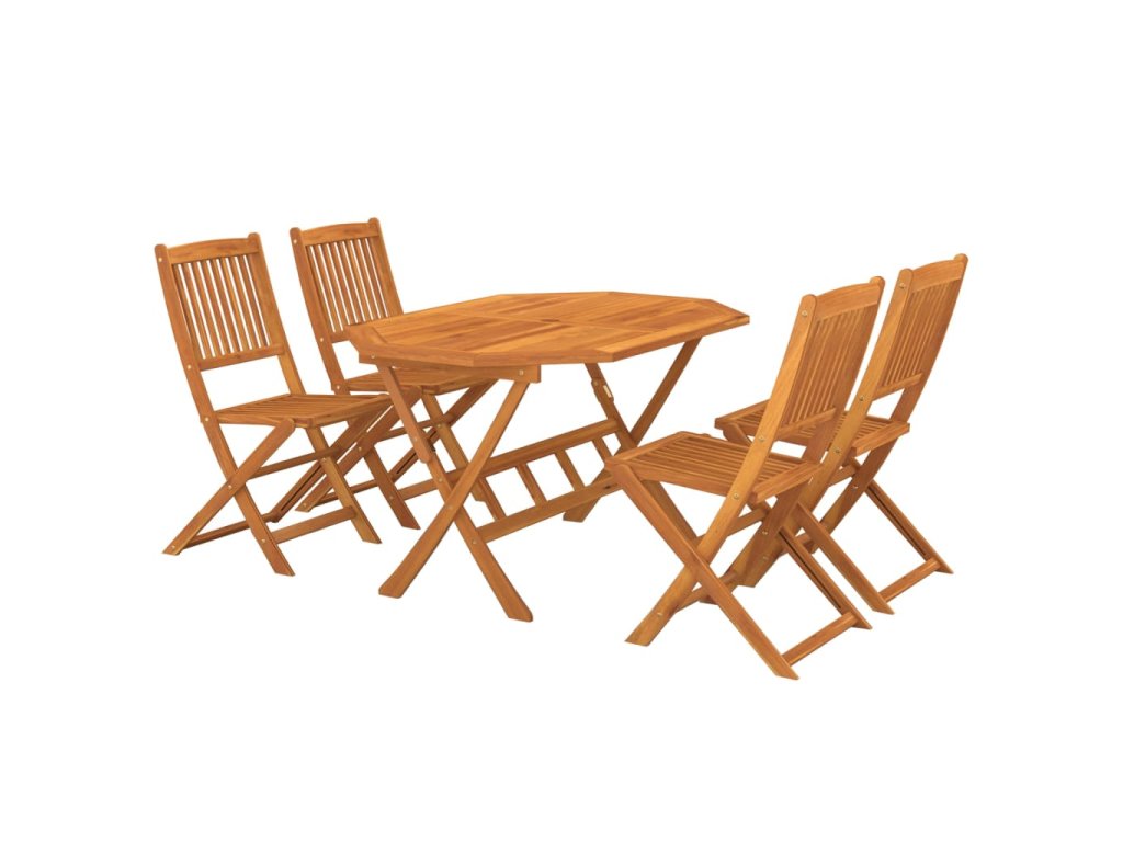 Venkovní jídelní set je vyrobený z masivní akácie, což je tropické tvrdé dřevo, které je odolné a výborně vzdoruje povětrnostním vlivům, takže vám vydrží sloužit po dlouhá léta. Olejovaný povrch se navíc snadno čistí vlhkým hadříkem. Pokud židle a stůl právě nepoužíváte, můžete je složit do kompaktní velikosti, aby vám zbytečně nepřekážely.