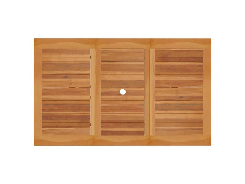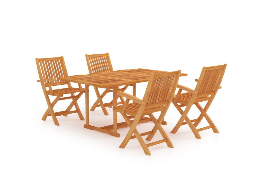 Nábytková sestava má překrásnou povrchovou úpravu, která dřevu dodává hřejivý odstín. Ve stolu se nachází otvor na slunečník, abyste se mohli chránit před sluncem. Zaoblené sedáky a opěradla židlí ideálně kopírují tvar vašeho těla. Židle mají navíc skládací design, aby vám zbytečně nepřekážely, když je zrovna nepoužíváte. Lehká konstrukce usnadňuje jejich přesouvání. Celá sada nábytku vám poskytne maximální pohodlí a zpříjemní vám čas strávený s vaší rodinou a přáteli. K očištění vám přitom postačí navlhčený hadřík.