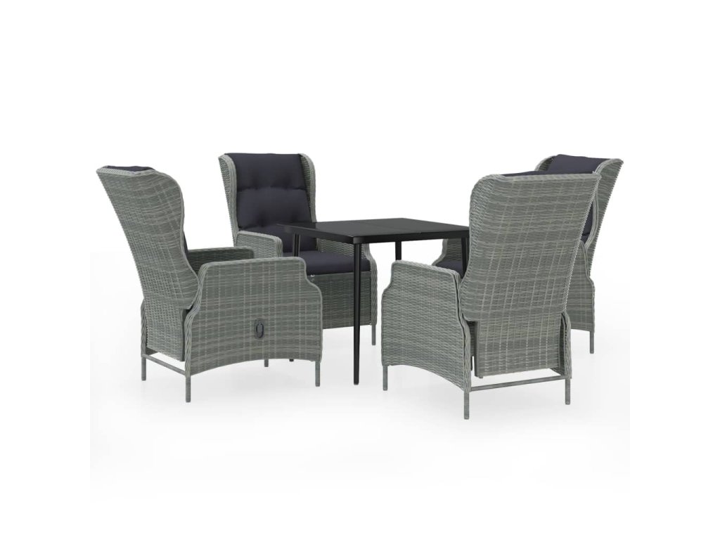 Praktický zahradní jídelní set má ocelový rám, takže je pevný a má dlouhou životnost. Polohovací židle jsou vyrobené z voděodolného PE ratanu, který nevyžaduje žádnou údržbu, hodí se proto skvěle k venkovnímu použití. Hustě polstrované podušky vám při stolování poskytnou maximální pohodlí. Potah podušky je opatřený zipem, lze ho tedy stáhnout a vyprat. Pomocí mechanismu s plynovým pístem si navíc snadno přizpůsobíte opěradlo křesla podle vlastních potřeb. Stisknutím tlačítka na boku ho sklopíte do té nejpohodlnější pozice. Hladká skleněná stolní deska, kterou jednoduše očistíte vlhkým hadříkem, je ideální k podávání jídla a pití nebo k vystavování různých dekorativních předmětů.