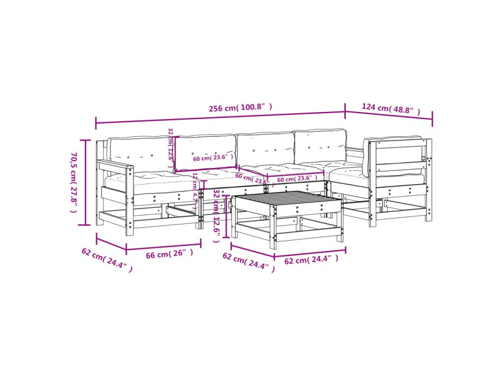 - Rozměry středové pohovky: 62 x 62 x 70,5 cm (D x Š x V)