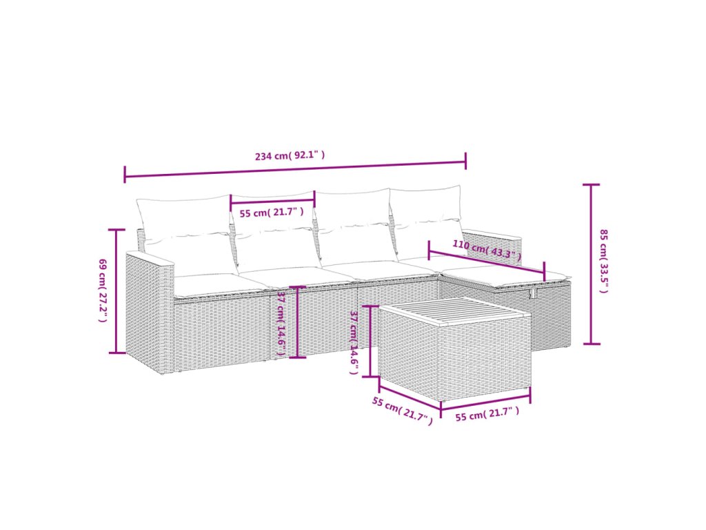 Tato zahradní sedací souprava je dokonalým doplňkem vaší zahrady, terasy nebo dvorku a poskytne vám pohodlné a příjemné místo, kde si můžete povídat s rodinou a přáteli nebo jen tak odpočívat a užívat si pobyt venku.