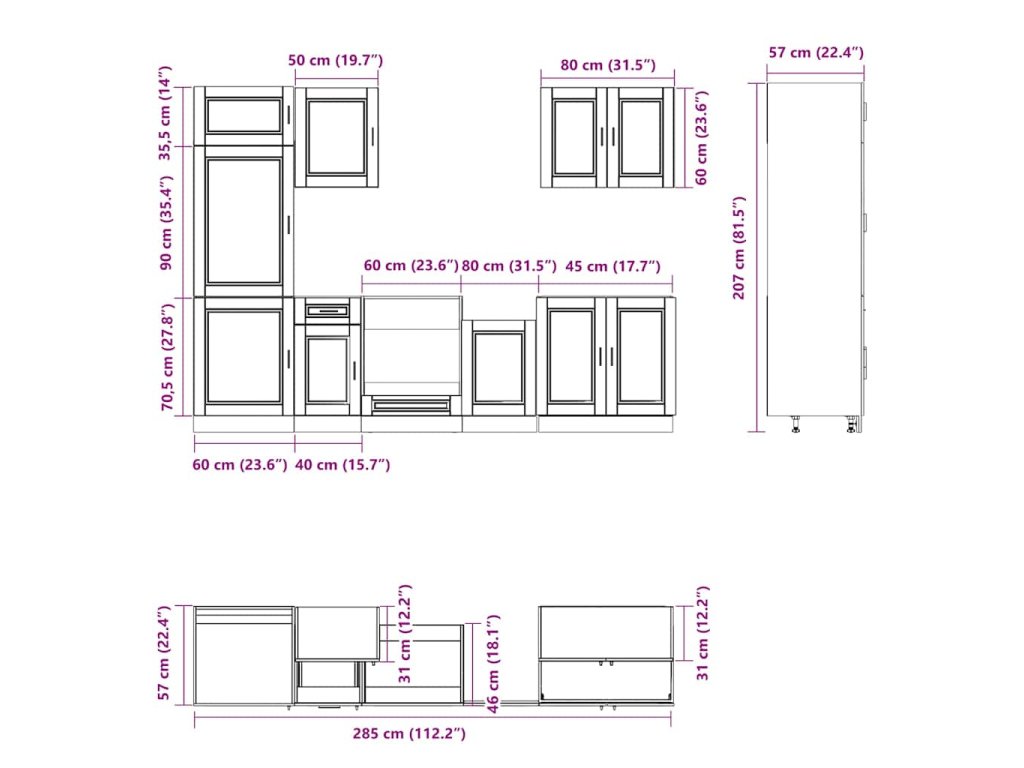 - 1x skříňka na troubu: 60 x 46 x 81,5 cm (Š x H x V)