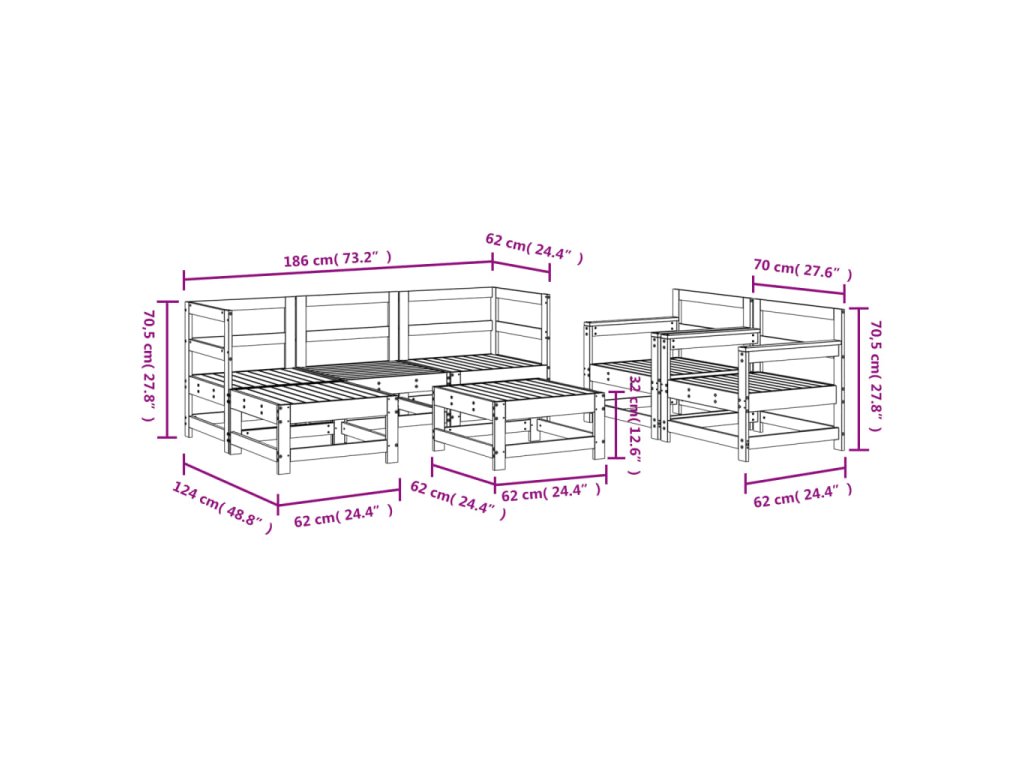- Rozměry středové pohovky: 62 x 62 x 70,5 cm (Š x H x V)