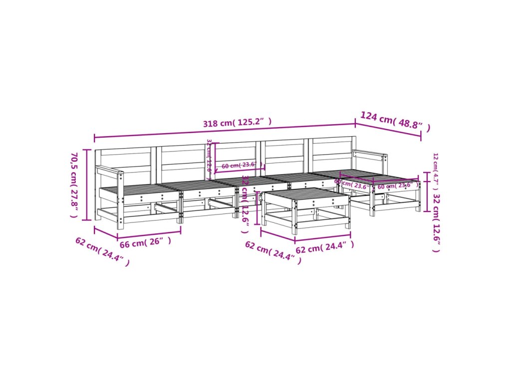 - Rozměry středové pohovky: 62 x 62 x 70,5 cm (D x Š x V)