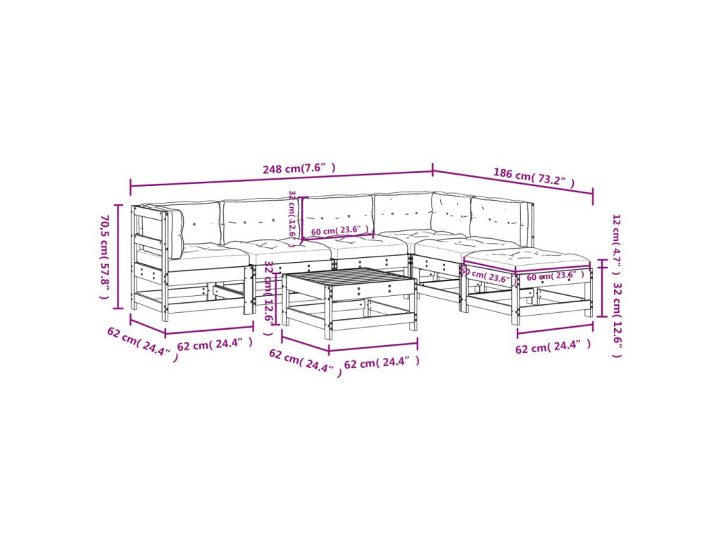 - Rozměry středové pohovky: 62 x 62 x 70,5 cm (D x Š x V)