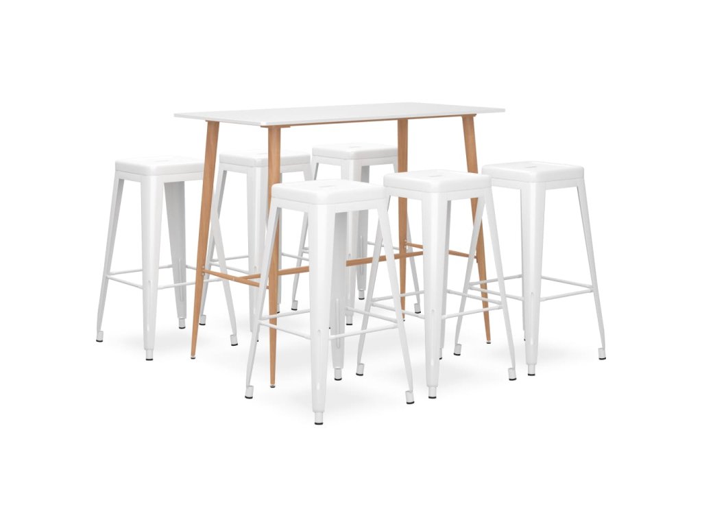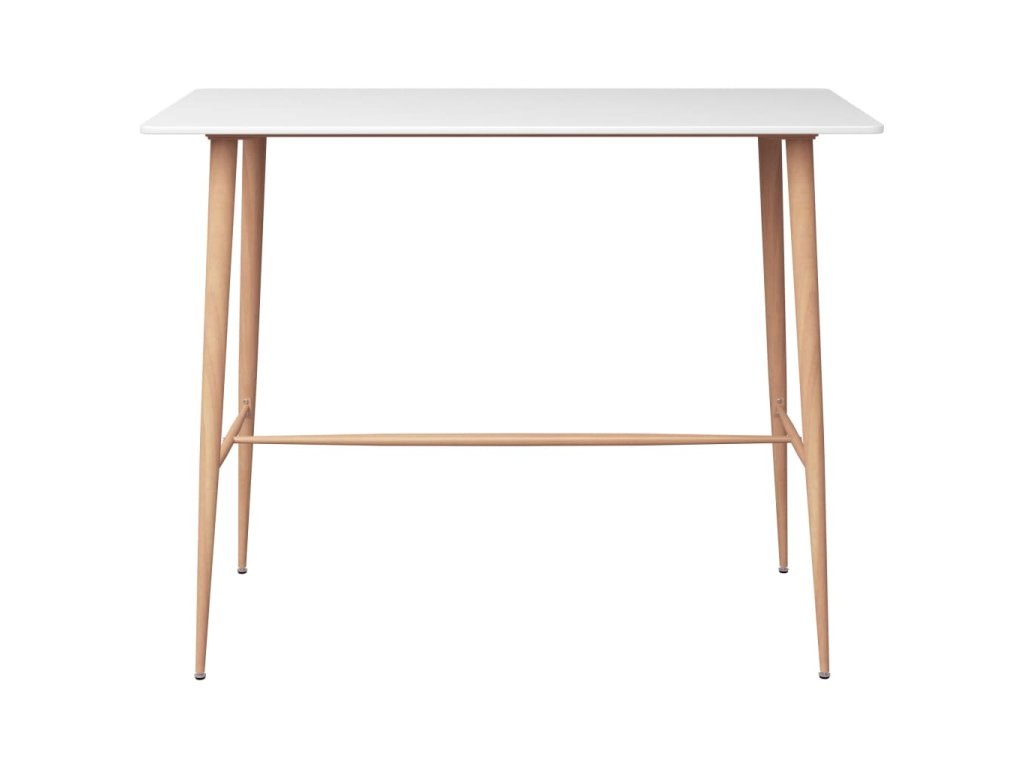 Náš vysoký stůl má horní desku z odolné MDF a pevné kovové nohy, které vzhledem připomínají dřevo. Barové stoličky jsou vyrobené z natíraného kovu, což jim zajišťuje mimořádnou robustnost a dlouhou životnost. Zesílená příčka pod sedákem a opěrka nohou zlepšují stabilitu. Židle lze navíc stohovat, aby se vám snáze skladovaly, jedná se tedy o dokonalé řešení pro omezené prostory.