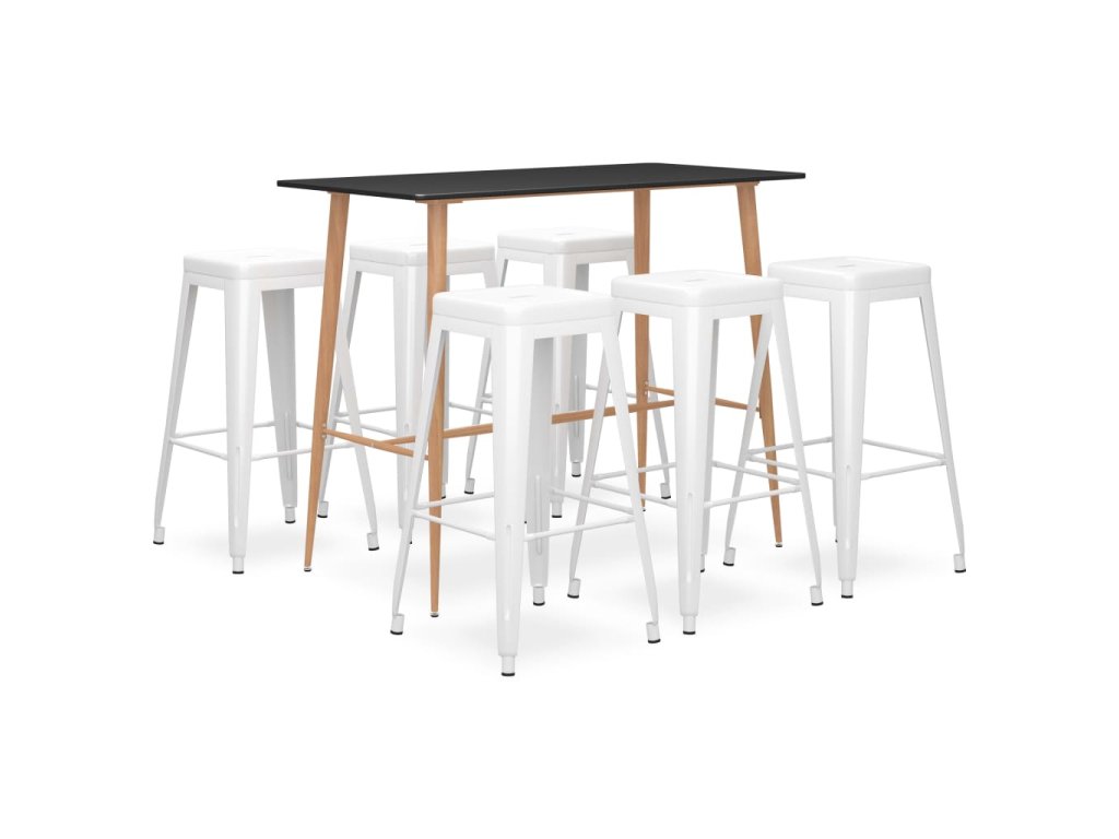 Náš vysoký stůl má horní desku z odolné MDF a pevné kovové nohy, které vzhledem připomínají dřevo. Barové stoličky jsou vyrobené z natíraného kovu, což jim zajišťuje mimořádnou robustnost a dlouhou životnost. Zesílená příčka pod sedákem a opěrka nohou zlepšují stabilitu. Židle lze navíc stohovat, aby se vám snáze skladovaly, jedná se tedy o dokonalé řešení pro omezené prostory.