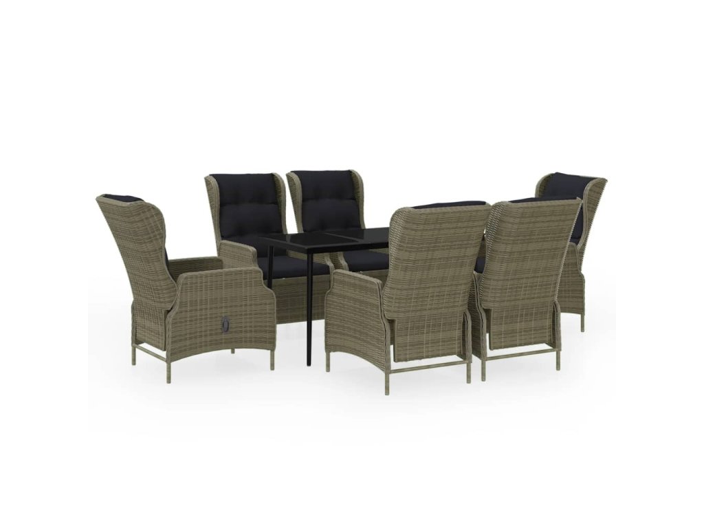 Praktický zahradní jídelní set má ocelový rám, takže je pevný a má dlouhou životnost. Polohovací židle jsou vyrobené z voděodolného PE ratanu, který nevyžaduje žádnou údržbu, hodí se proto skvěle k venkovnímu použití. Hustě polstrované podušky vám při stolování poskytnou maximální pohodlí. Potah podušky je opatřený zipem, lze ho tedy stáhnout a vyprat. Pomocí mechanismu s plynovým pístem si navíc snadno přizpůsobíte opěradlo křesla podle vlastních potřeb. Stisknutím tlačítka na boku ho sklopíte do té nejpohodlnější pozice. Hladká skleněná stolní deska, kterou jednoduše očistíte vlhkým hadříkem, je ideální k podávání jídla a pití nebo k vystavování různých dekorativních předmětů.