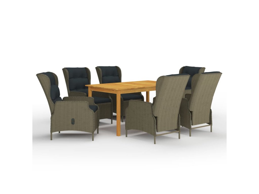 Jídelní stůl je zhotovený z masivního akáciového dřeva s olejovaným povrchem, takže je stabilní, odolný a nenáročný na údržbu. Zahradní židle mají rám z práškově lakované oceli, opletený klimaticky odolným kulatým PE ratanem, jsou tudíž odolné a snadno se čistí. Hustě polstrované podušky vám při odpočinku zaručí mimořádný komfort. Jejich potahy jsou opatřené zipem, abyste je mohli bez námahy stáhnout a oprat. Židle disponují mechanismem s plynovým pístem, umožní vám tedy také nastavit opěradlo do různých poloh. Stačí stisknout tlačítko na boku a opěradlo se sklopí do pohodlné pozice vleže. Vzhledem k lehké konstrukci lze jídelní židle jednoduše přesouvat, kam potřebujete.