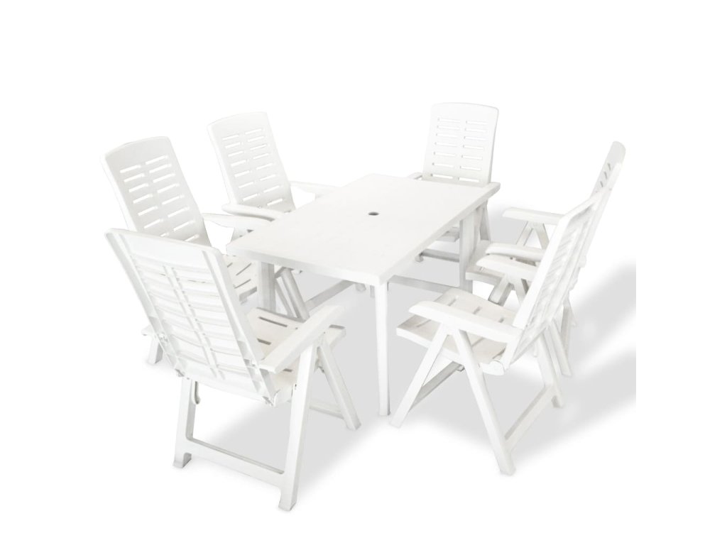 Zahradní stůl má uprostřed otvor na slunečník, který si můžete roztáhnout a užívat si odpočinku v chládku. Opěradla židlí jsou polohovatelná do 4 pozic, takže se v nich můžete pohodlně usadit. Pokud židle zrovna nepotřebujete, můžete je složit a ušetřit tak prostor. Sada je vyrobena z odolného plastu. Díky tomu se stůl i židle snadno čistí a odolávají rozmarům počasí. Sada je mimo to velmi lehká a snadno se přenáší.