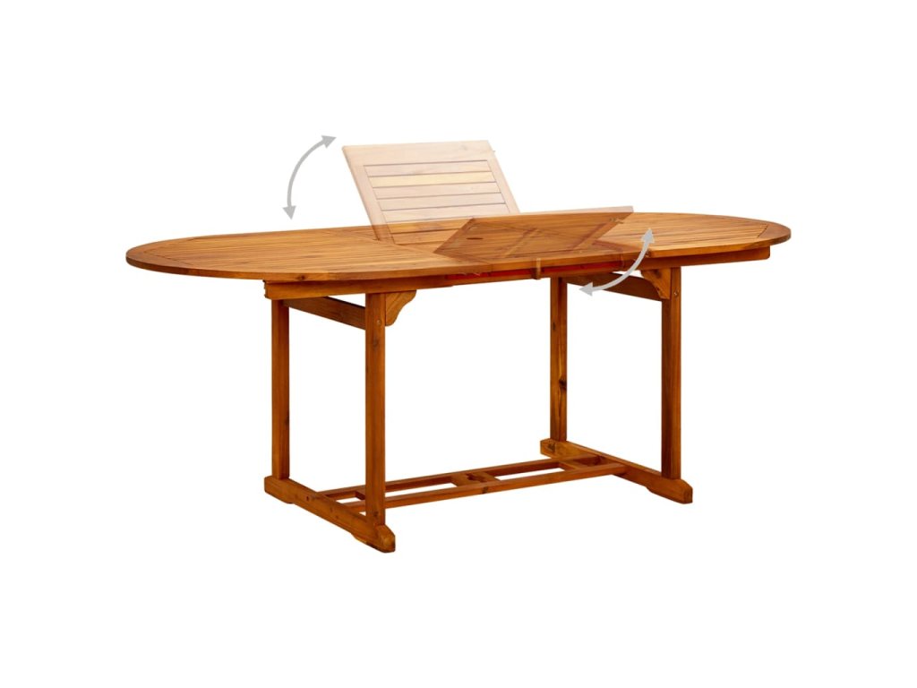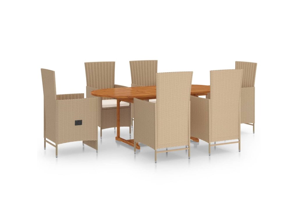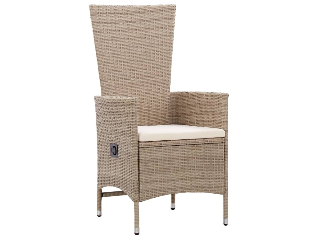 Jídelní stůl je zhotovený z masivního akáciového dřeva, takže je pevný a stabilní. Olejem napuštěný povrch vám umožní používat tento stůl i ve venkovních prostorech. Jídelní židle mají ocelový rám, který je opletený klimaticky odolným PE ratanem, jsou proto bytelné a snadno se udržují čisté. Područky jsou krásně zdůrazněné masivním akáciovým dřevem, které do vašeho domova vnese rustikální šarm. Stisknutím tlačítka na boku můžete sklopit opěradlo a zároveň i zvednout podnožku. Každá židle má hustě polstrovanou podušku, abyste si při odpočinku mohli dopřát mimořádný komfort.