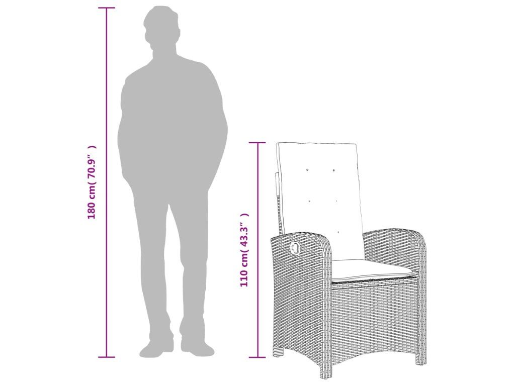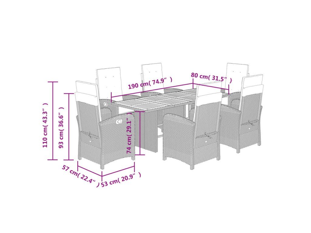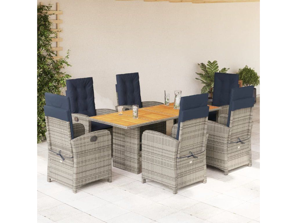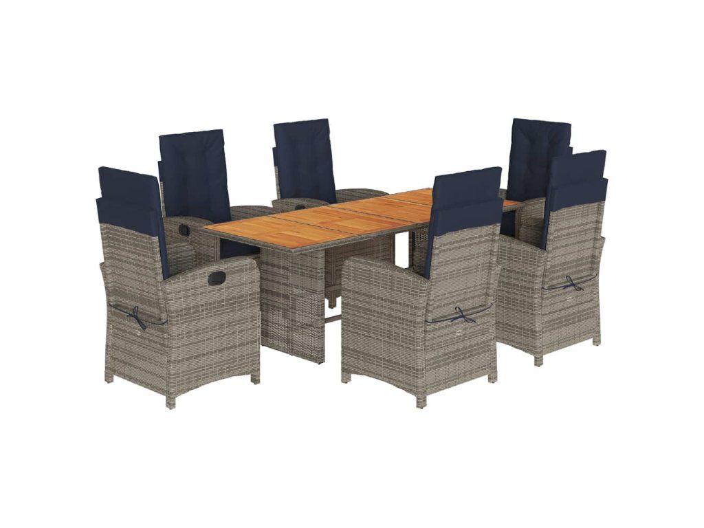 - Materiál: PE ratan, práškově lakovaná ocel, masivní akáciové dřevo s olejovou povrchovou úpravou