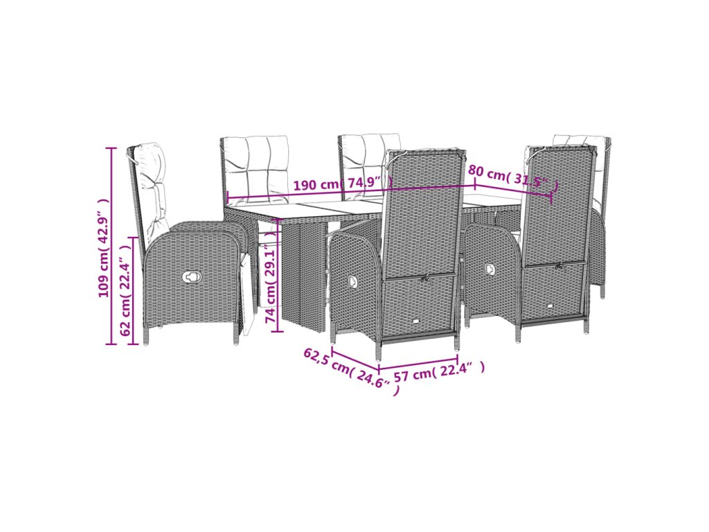 - Materiál: PE ratan, práškově lakovaná ocel, masivní akáciové dřevo s olejovou povrchovou úpravou