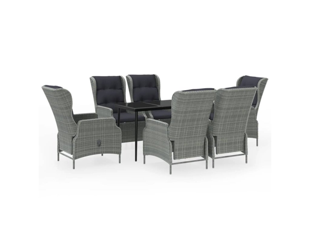 Praktický zahradní jídelní set má ocelový rám, takže je pevný a má dlouhou životnost. Polohovací židle jsou vyrobené z voděodolného PE ratanu, který nevyžaduje žádnou údržbu, hodí se proto skvěle k venkovnímu použití. Hustě polstrované podušky vám při stolování poskytnou maximální pohodlí. Potah podušky je opatřený zipem, lze ho tedy stáhnout a vyprat. Pomocí mechanismu s plynovým pístem si navíc snadno přizpůsobíte opěradlo křesla podle vlastních potřeb. Stisknutím tlačítka na boku ho sklopíte do té nejpohodlnější pozice. Hladká skleněná stolní deska, kterou jednoduše očistíte vlhkým hadříkem, je ideální k podávání jídla a pití nebo k vystavování různých dekorativních předmětů.