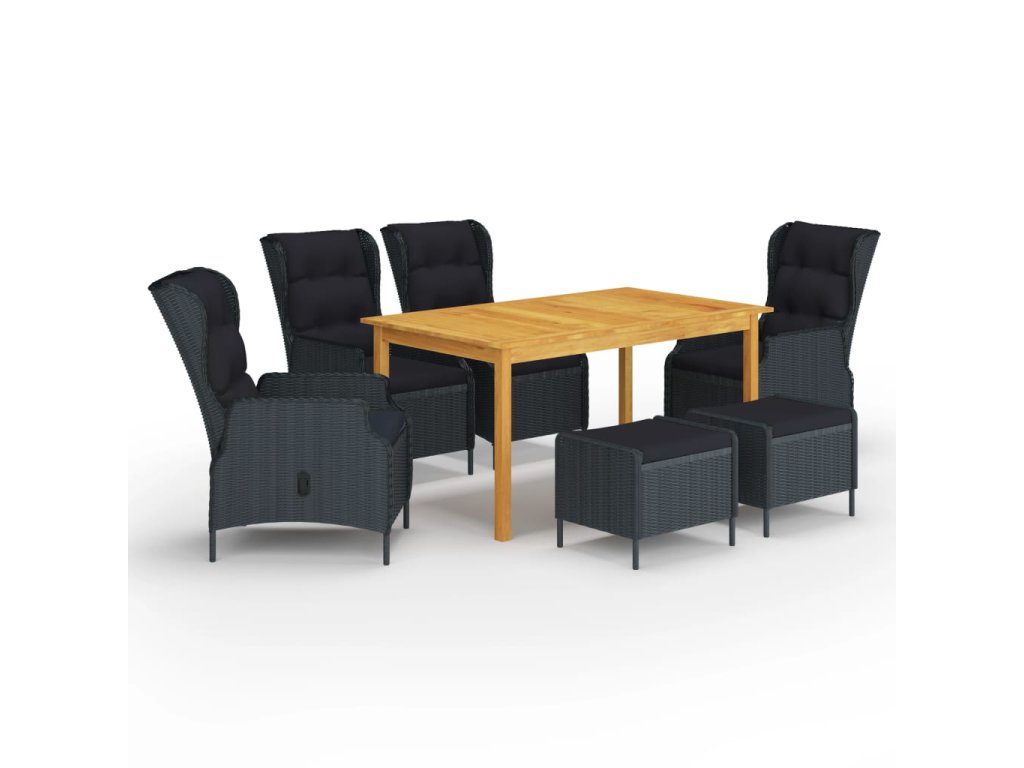 Jídelní stůl je zhotovený z masivního akáciového dřeva s olejovaným povrchem, takže je stabilní, odolný a nenáročný na údržbu. Zahradní židle a stolička mají rám z práškově lakované oceli, opletený kulatým PE ratanem, dlouho vám proto vydrží a snadno je očistíte. Hustě polstrované podušky vám při odpočinku zaručí mimořádný komfort. Jejich potahy jsou opatřené zipem, abyste je mohli bez námahy stáhnout a oprat. Židle disponují mechanismem s plynovým pístem, umožní vám tedy také nastavit opěradlo do různých poloh. Stačí stisknout tlačítko na boku a opěradlo se sklopí do pohodlné pozice vleže. Vzhledem k lehké konstrukci lze jídelní židle i stoličku jednoduše přesouvat, kam potřebujete.