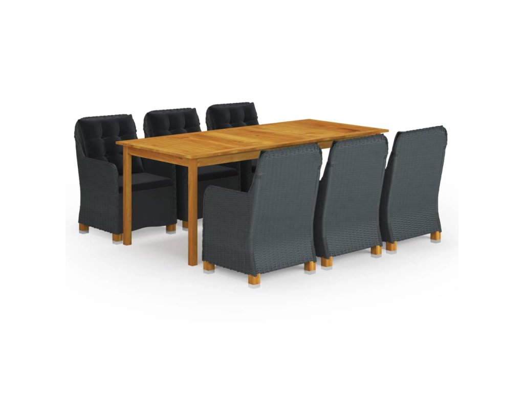 Jídelní stůl je zhotovený z masivního akáciového dřeva s olejovaným povrchem, takže je stabilní, odolný a nenáročný na údržbu. Zahradní židle mají rám z práškově lakované oceli, opletený kulatým PE ratanem, který výborně vzdoruje klimatickým vlivům. Dlouho vám proto vydrží a snadno je očistíte. Hustě polstrované podušky vám při odpočinku zaručí mimořádný komfort. Jejich potahy jsou opatřené zipem, abyste je mohli bez námahy stáhnout a oprat. Nohy z masivního akáciového dřeva přispívají k lepší stabilitě a delší životnosti. Vzhledem k jejich lehké konstrukci lze jídelní židle jednoduše přesouvat, kam potřebujete.