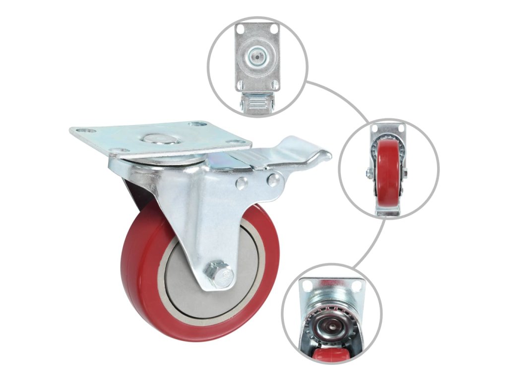 Tato kolečka jsou vyrobena z PP (polypropylenu), který je známý pro svou schopnost pohlcovat nárazy a vibrace. Ať už tedy kolečka namontujete na cokoliv, budete to moci přesouvat hladce a v tichosti. Jejich hladký povrch navíc ochrání vaši podlahu před poškrábáním. Zinkem potažený železný rám je odolný proti rzi, dodává kolečkům na odolnosti a prodlužuje jejich životnost. Tato otočná kolečka jsou vybavená brzdou pro flexibilnější ovládání. Každé kolečko má maximální nosnost až 80 kg.