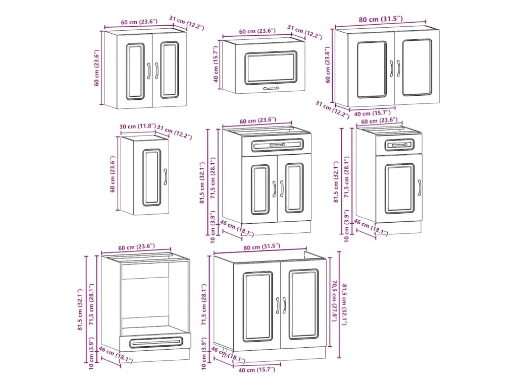 - 1x skříňka na troubu: 60 x 46 x 81,5 cm (Š x H x V)