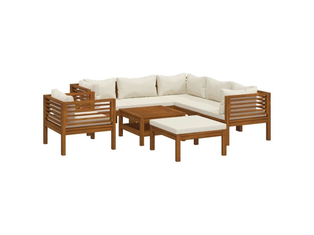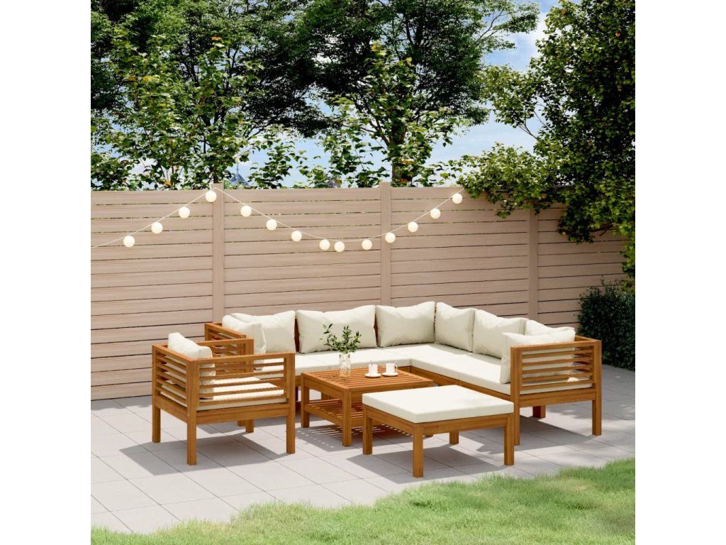 Rám z masivního akáciového dřeva je pevný, odolný a má dlouhou životnost. Dřevo je napuštěné olejem, sedací souprava je proto vhodná i pro venkovní použití. Odnímatelné podušky jsou silně polstrované, takže se vám na nich bude nesmírně dobře sedět. Součástí balení je také konferenční stolek v unikátním laťkovém provedení. Nevšední modulární design vám umožní všechny díly přestavovat a upravovat dle momentálních potřeb.