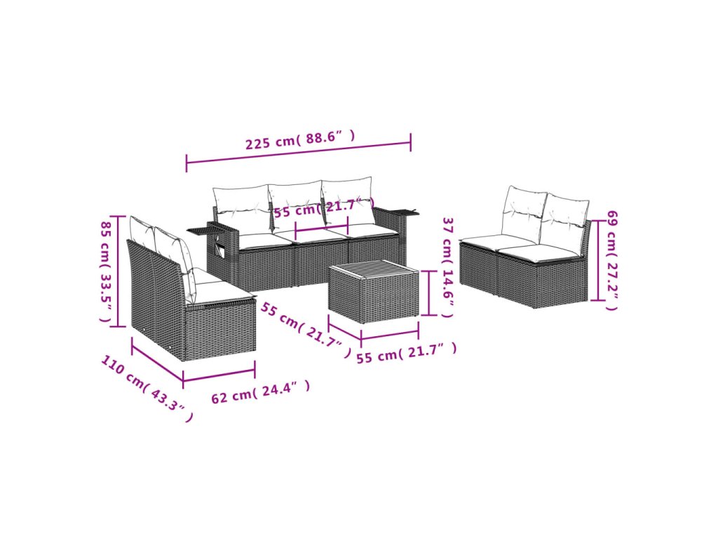 Tato zahradní sedací souprava je dokonalým doplňkem vaší zahrady, terasy nebo dvorku a poskytne vám pohodlné a příjemné místo, kde si můžete povídat s rodinou a přáteli nebo jen tak odpočívat a užívat si pobyt venku.