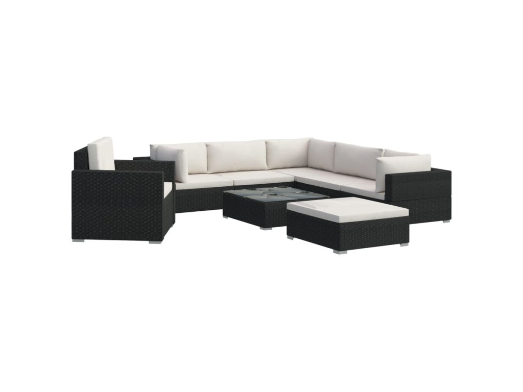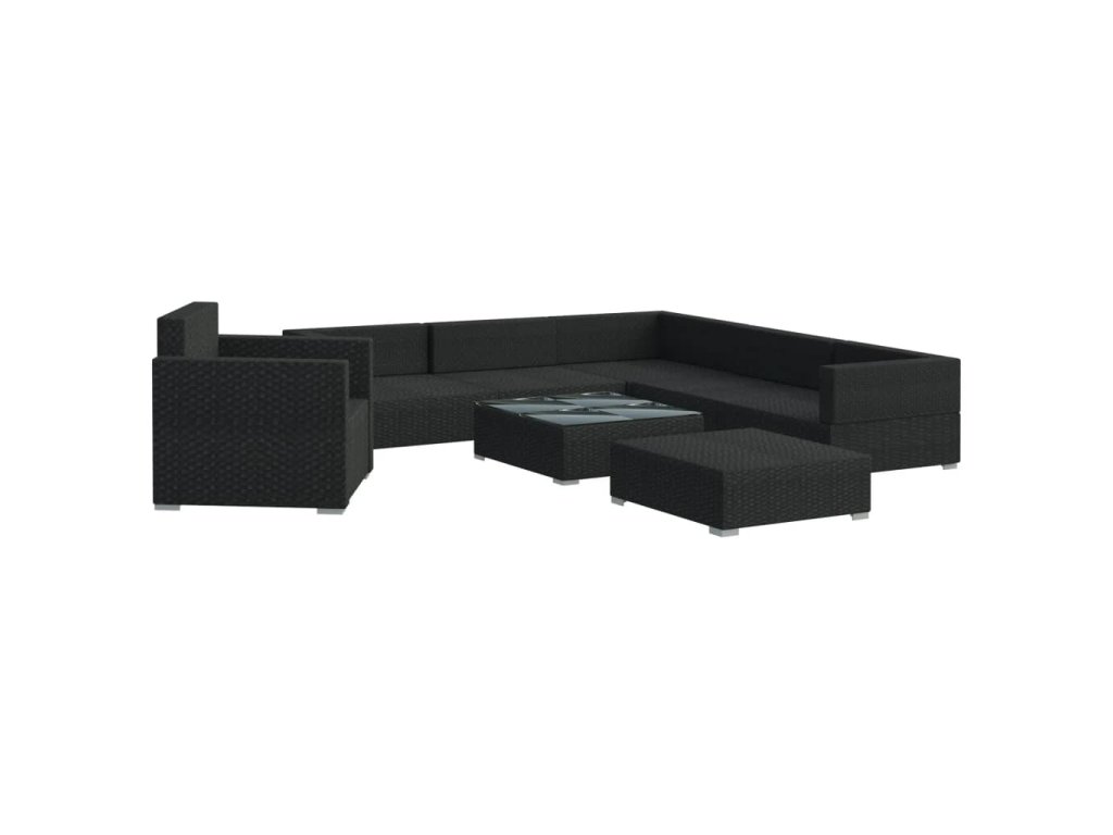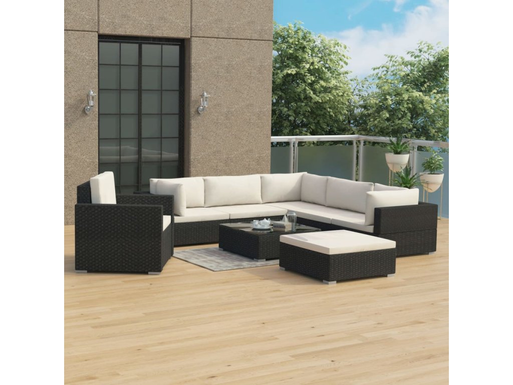 Balení obsahuje 3 rohové pohovky, 2 středové pohovky, 1 podnožku, 1 křeslo, 1 konferenční stolek, 7 podušek na sedáky a 9 podušek na opěradla. Poznámka: Doporučujeme vám soupravu za deště, sněhu a mrazu přikrýt.
