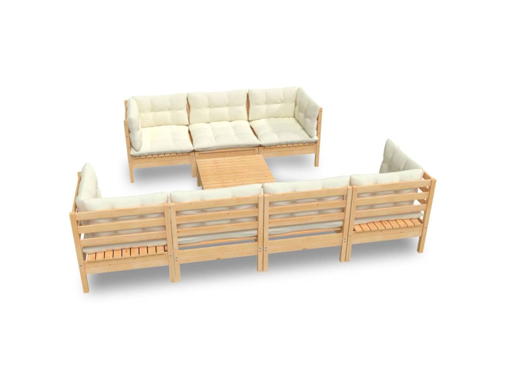 Zahradní sedací souprava je vyrobená z masivního borového dřeva, které je pevné a zaručuje výbornou stabilitu. Podušky vám poskytnou maximální pohodlí. Pohovku můžete navíc zkombinovat s dalšími modulárními segmenty, a vytvořit si tak sedací soupravu přesně podle vašich představ!